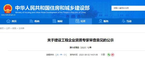按照《行政许可法》及有关建设工程企业资质管理规定,我部对近期申请建设工程企业资质的申报材料组织了专家审查,现将专家审查意见在住房和城乡建设部门户网站(https://www.mohurd.gov.cn)予以公示,以广泛接受社会监督。企业申报材料中的人员、代表工程业绩等详细情况,可通过点击“住房和城乡建设部门户网站→建设工程企业资质行政审批专栏→资质申报基本信息公示”进行查询。