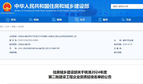 近日,住建部发布关于核准2024年度第二批建设工程企业资质延续名单的公告。