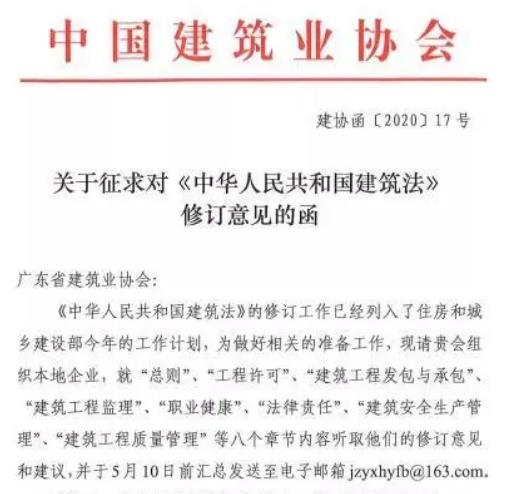 近日,中国建筑业协会公布《关于征求对〈中华人民共和国建筑法〉修订意见的函》,就《建筑法》“ 总则”、“ 工程许可”、“ 建筑工程发包与承包”、“ 建筑工程监理”、“ 建筑安全生产管理”、“ 建筑工程质量管理”、“ 职业健康”、“ 法律责任”等八个章节征求修订意见和建议。