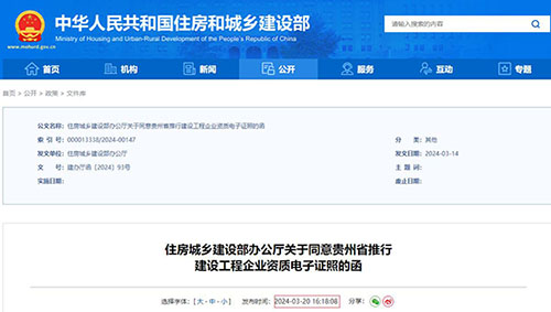 《关于申请推行建设工程企业资质电子证照的请示》(黔建呈〔2024〕15号)收悉。经研究,同意贵州省推行建筑业企业、工程监理企业、工程勘察企业、工程设计企业等4类建设工程企业资质电子证照。